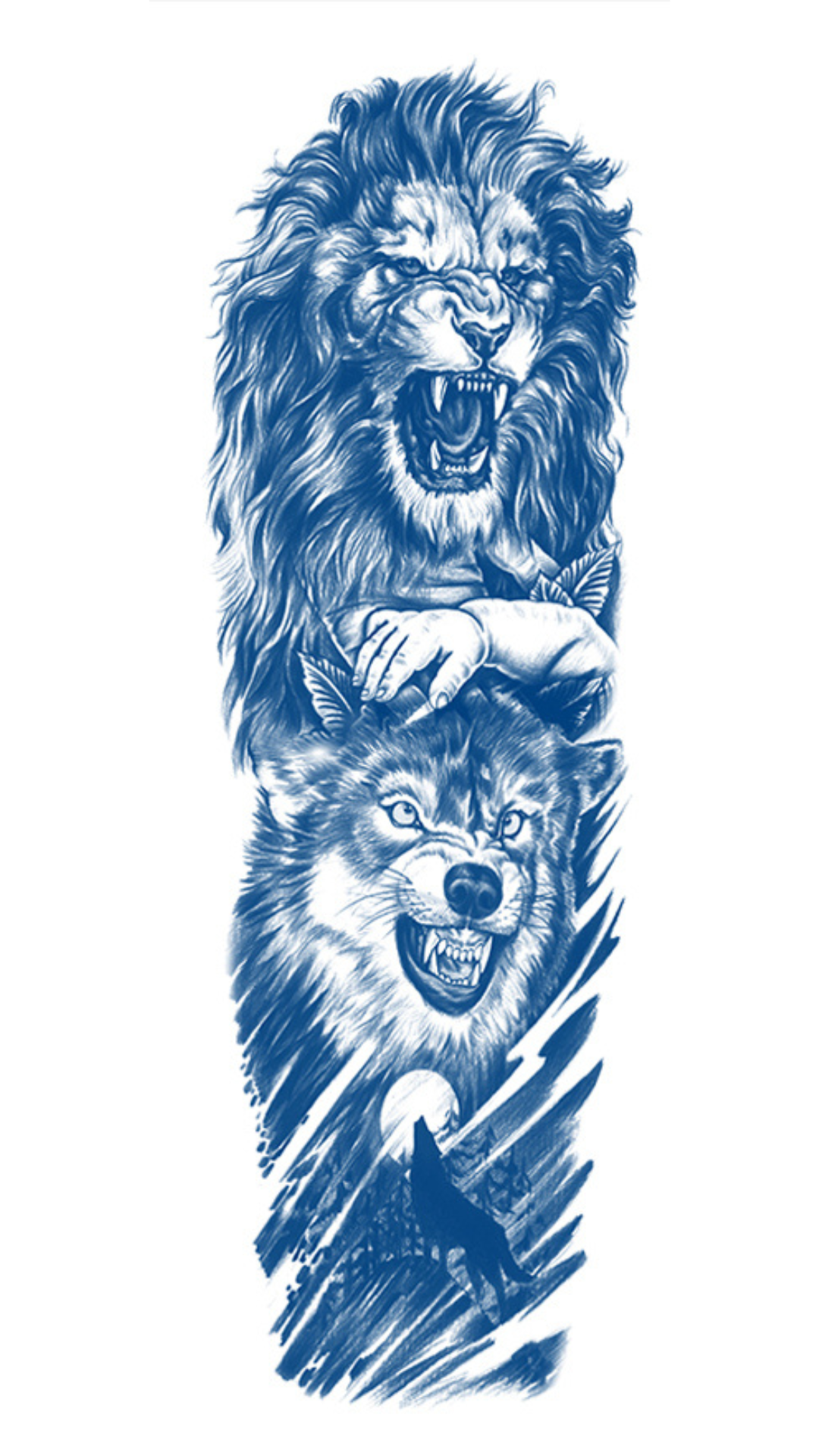 Válaszd az állati ösztönök, a dominancia és a hűség erejét ezzel a drámai, teljes karos ideiglenes tetoválással. A „A Vad Természet” dizájn két fenséges ragadozót ábrázol: a felső részen egy ordító oroszlán látható, amely a bátorságot, a királyságot és a hatalmat szimbolizálja, közvetlenül alatta pedig egy dühös farkas néz szembe, amely a hűséget, a védelmet és a fékezhetetlen szellemet jelképezi. A kompozíció alsó részét egy üvöltő farkas sziluettje és egy sötét hegyvidék teszi teljessé, ami a kihívásokat és a kitartást sugallja. A sötétkék árnyalatú, részletgazdag „sleeve” hatású minta azonnali, erőteljes és szimbolikus megjelenést biztosít.