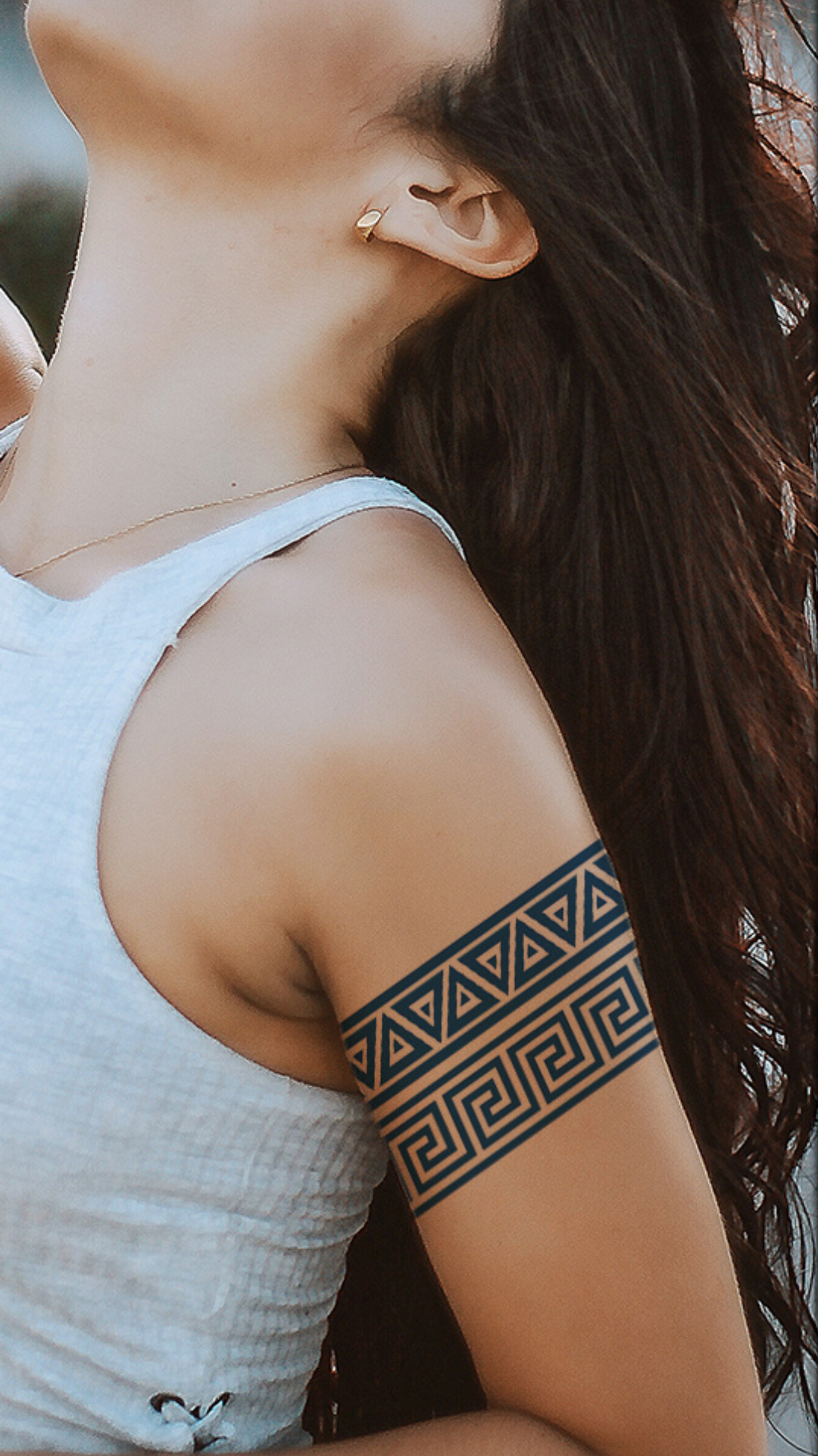 Tegyél utazást az ókori civilizációk világába ezzel a látványos, görög mintás karszalag ideiglenes tetoválással. A dizájn két klasszikus, ismétlődő motívumot ötvöz: az egyik sáv a jól ismert görög kulcs (Meander) mintát mutatja, amely az örökkévalóságot és a végtelen áramlást szimbolizálja, míg a másik sávban dinamikus, egymásba illeszkedő háromszögek láthatók, amelyek az erőt és a stabilitást jelképezik. A tiszta vonalak elegáns, időtlen megjelenést kölcsönöz a karon, a lábon vagy a csuklón.