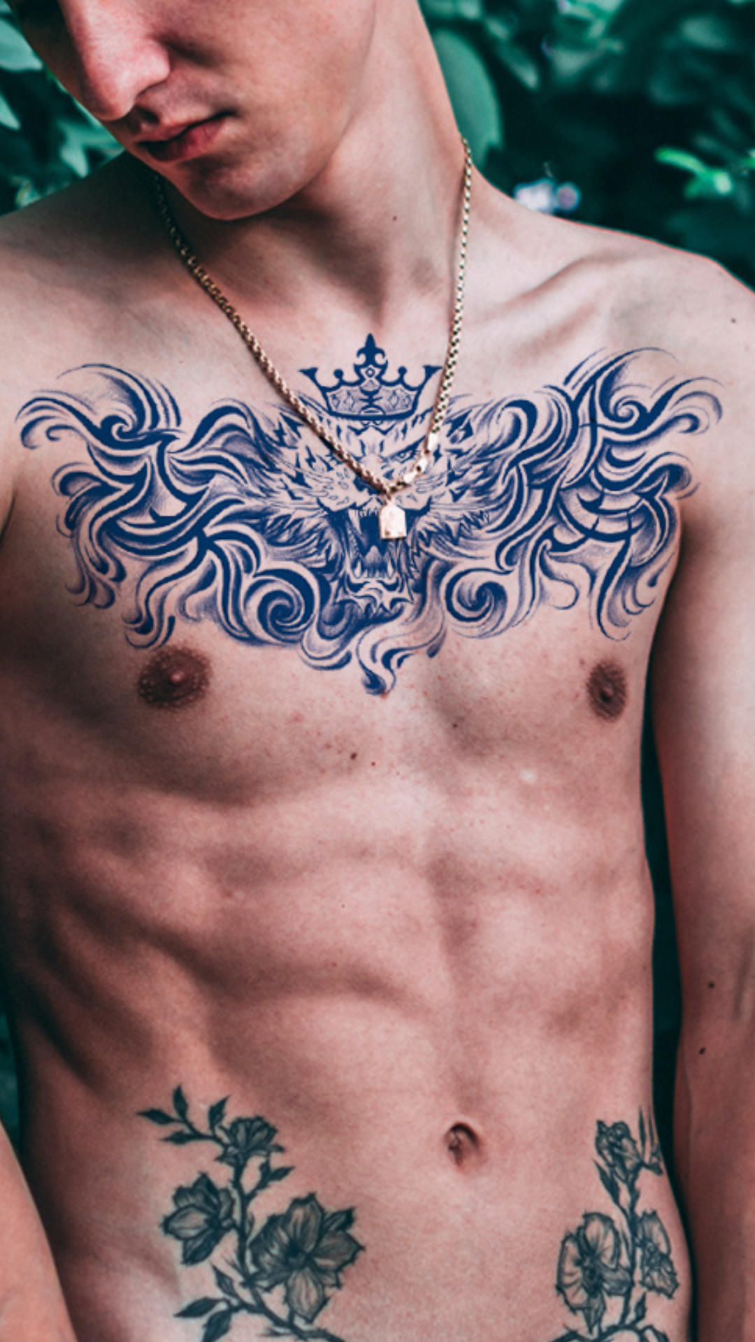 Készülj fel egy rendkívül erőteljes megjelenésre ezzel a nagyméretű, törzsi stílusú mellkas tetoválással. A dizájn egy dühödt oroszlánfejet ábrázol, melyet egy díszes korona ékesít – az erőt, a bátorságot és a méltóságot szimbolizálva. Az oroszlánt hullámzó, absztrakt örvények és lángnyelvek veszik körül, amelyek lendületes és dinamikus, „aurát” hoznak létre a mellkason és a karon. A radikális vonalvezetés egy igazi harcos vagy király megjelenését idézi. Ideális választás azoknak, akik a testüket egy feltűnő és férfias, szimbolikus motívummal szeretnék díszíteni.