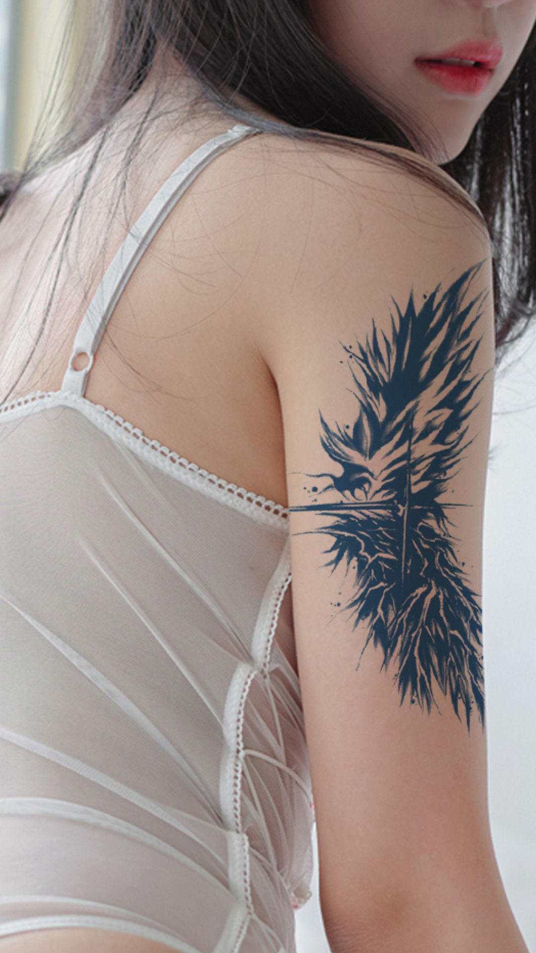 Válaszd az absztrakt erő és a szabadság drámai megjelenését ezzel a függőleges ideiglenes tetoválással. Az „Égi Harcos” dizájn egy szétrobbanó, szilánkos hatású tollazatot ábrázol, amely a vad, fékezhetetlen szellemet és a repülés sebességét szimbolizálja. A minta közepén egy éles, vízszintes vonal fut végig, amely egy kard vagy nyíl hatását kelti, ezzel felerősítve a bátorság és a harci szellem érzetét. Ez a stílus modern, művészi hatást kölcsönöz. Kiválóan mutat a karon vagy a háton.