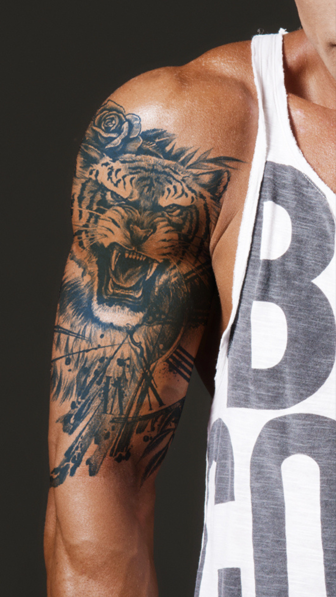 Ez a lenyűgöző dizájn egy ordító, részletgazdag tigrisfejet ábrázol, amely a vad erőt és a fékezhetetlen szellemet szimbolizálja. A kompozíciót egy klasszikus, római számos zsebóra számlapja és egy finom rózsa motívum teszi teljessé, melyek az idő múlását és a változó szépséget jelképezik. Az ecsetvonások és fröccsenések modern, művészi hatást kölcsönöznek, kiemelve a tigris szőrzetének drámaiságát. Mérete és intenzitása miatt ideális a kar, váll, hát vagy láb díszítésére.