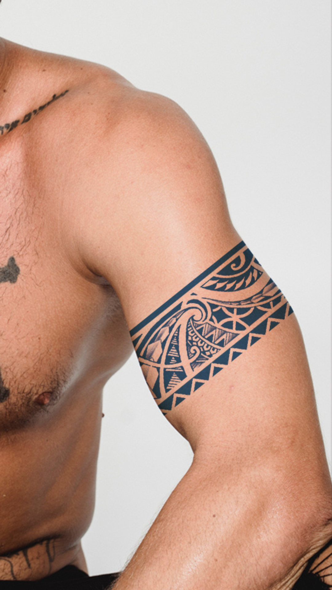 Öltöztesd fel a karod vagy a lábad az óceán erejével ezzel az elegáns, maori/polinéz stílusú karszalag ideiglenes tetoválással. Ez a minta a hagyományos törzsi dizájnokat ötvözi, különösen hangsúlyozva a hullámok és a cápafogak motívumait, melyek a kitartás, az alkalmazkodóképesség és a védelem szimbólumai. A sűrű, sötétkék mintázat mélységet és textúrát ad a bőrnek, lenyűgöző kontrasztot teremtve. Tökéletes választás azok számára, akik egy merész, kulturális ihletésű karszalagot keresnek.